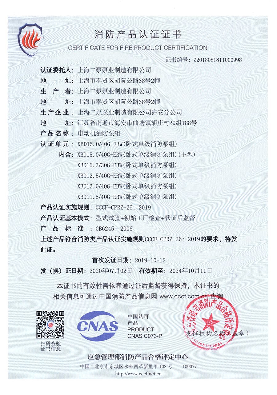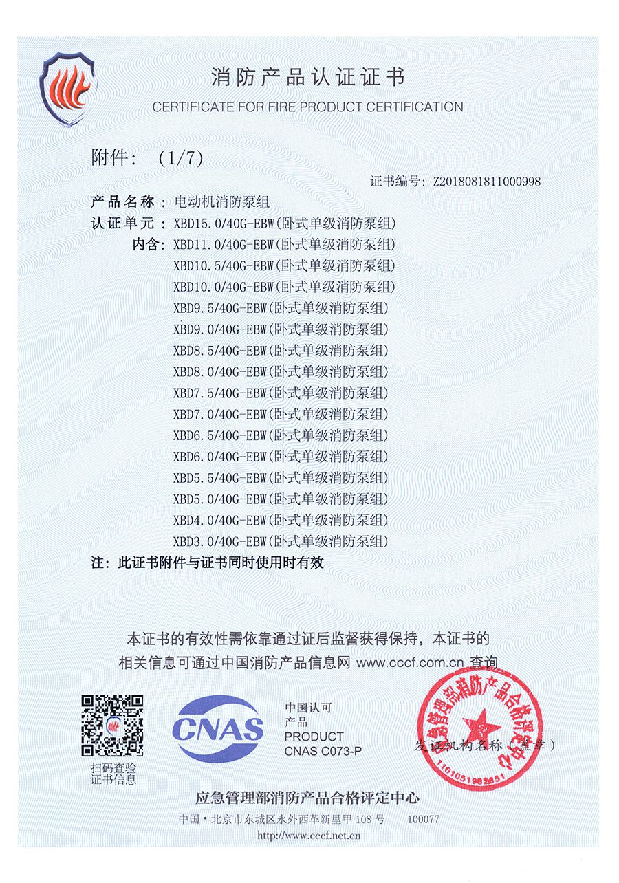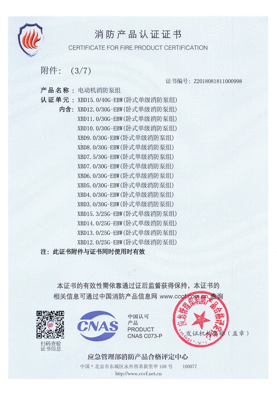 臥式單級(jí)EBW-消防產(chǎn)品認(rèn)證證書(shū)