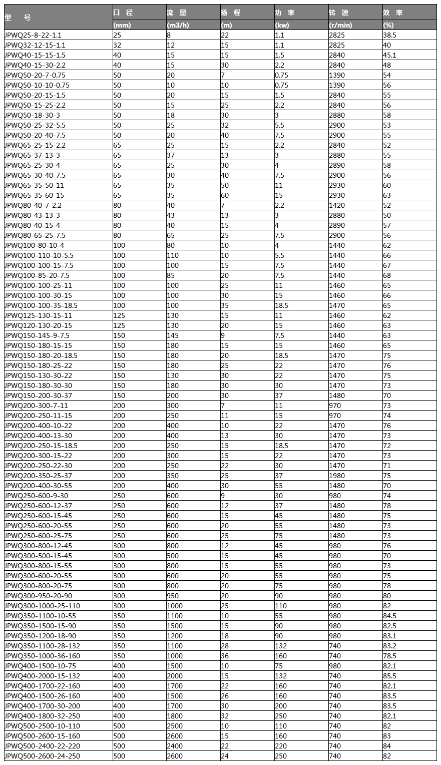 JPWQ 50 - 20 - 15 - 1.5 | | | | |__ 電機(jī)功率:KW | | | |_________ 額定揚(yáng)程H:M | | |_______________ 額定流量Q:M3/H | |_____________________ 出水口徑直徑MM |_____________________________ 切割式無(wú)堵塞潛水排污泵
